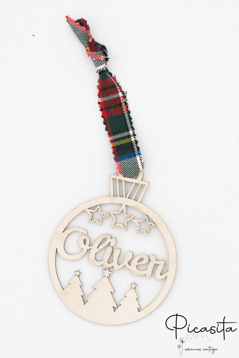 Le nom de la personne choisie est intĂ©grĂ© directement dans le design par dĂ©coupe laser. Cela crĂ©e une piĂšce unique oĂč les lettres font partie intĂ©grante de la structure en bois de lâornement.