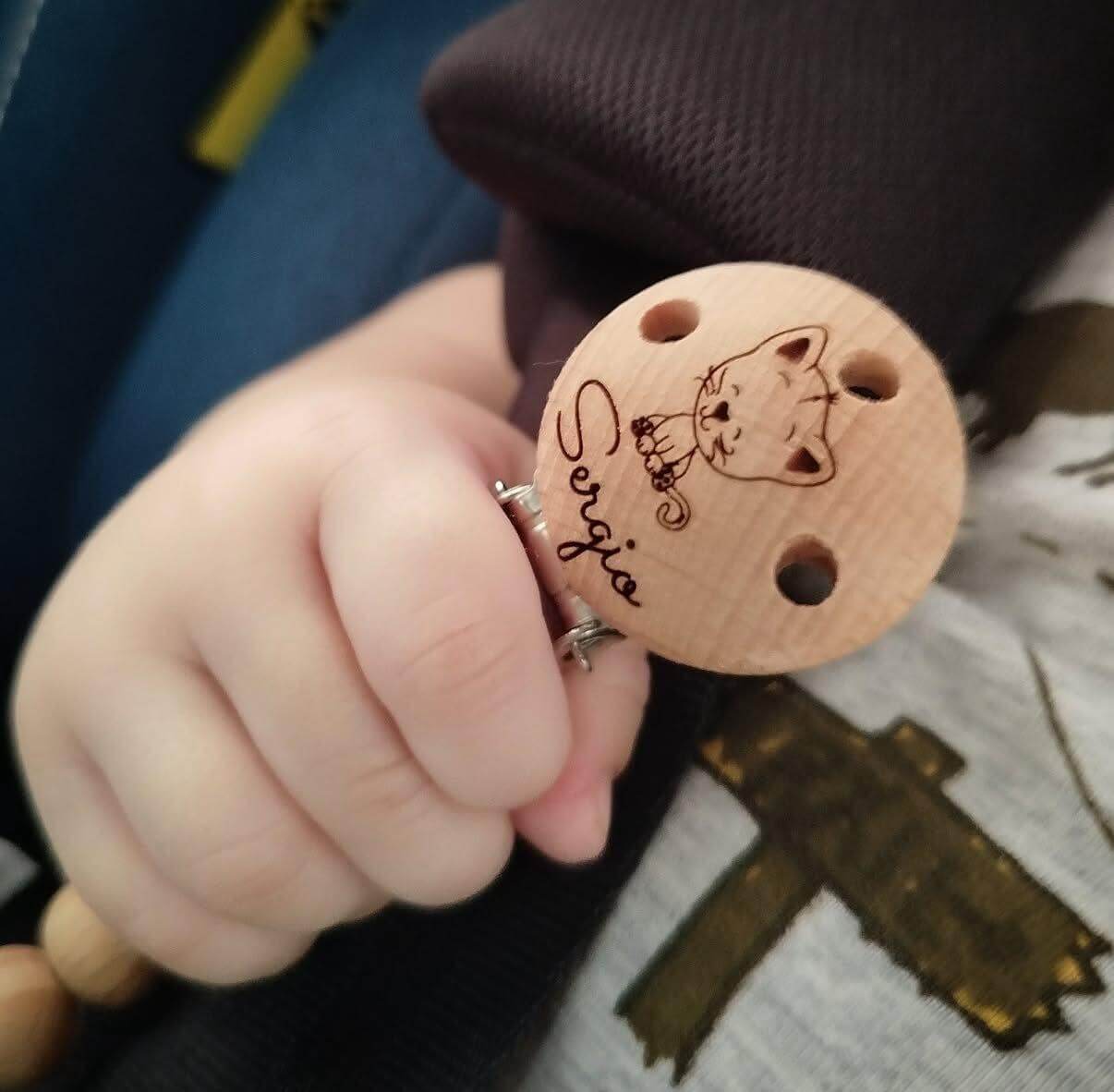 Tout à fait sûre ! La gravure laser n’utilise aucun type d’encre, vernis ni produit chimique. Elle modifie simplement la surface du bois de hêtre par la chaleur, la rendant lisse, indélébile et sans aucun risque de toxicité lorsque le bébé porte l’attache-sucette à la bouche.