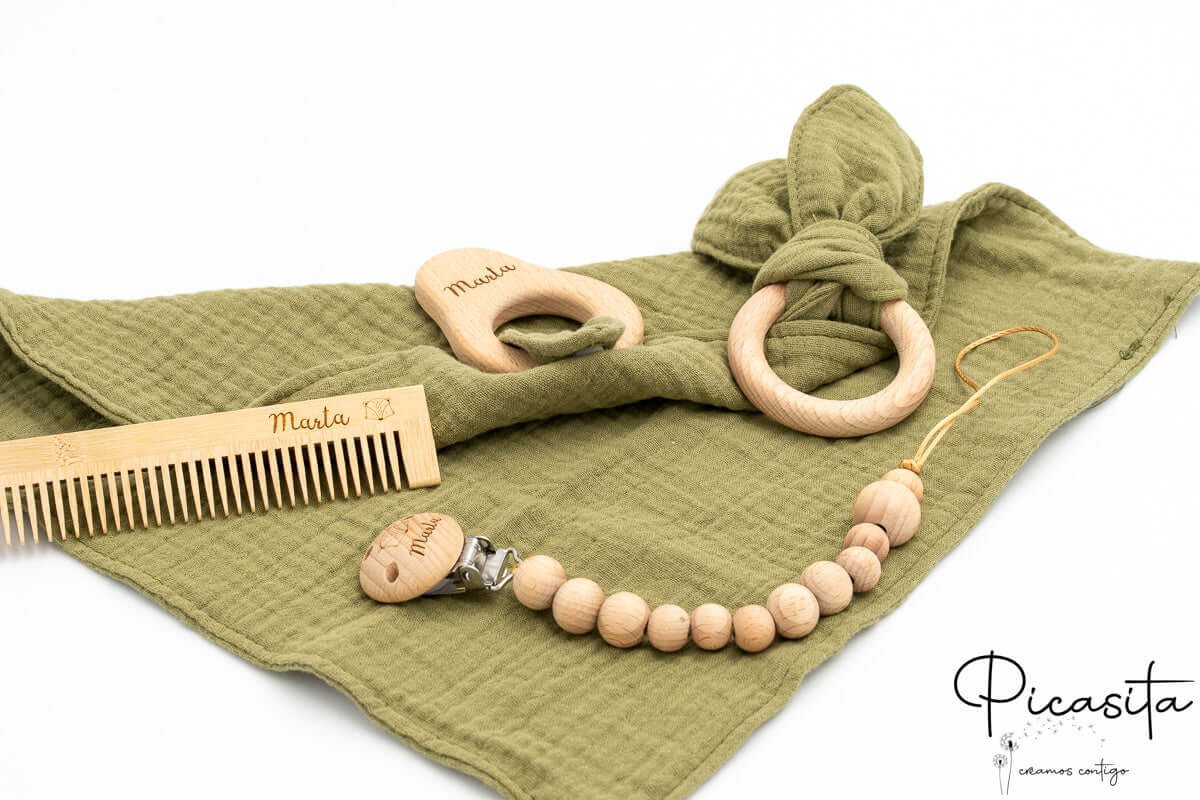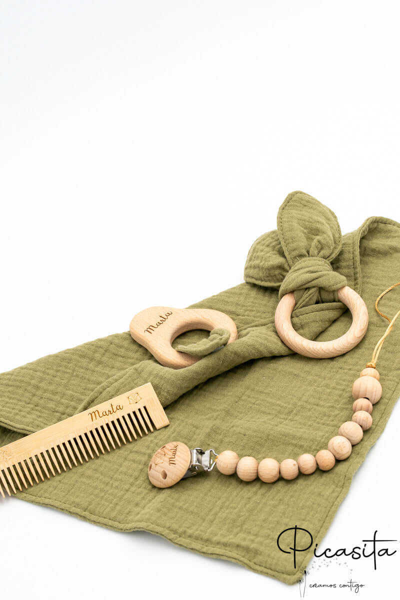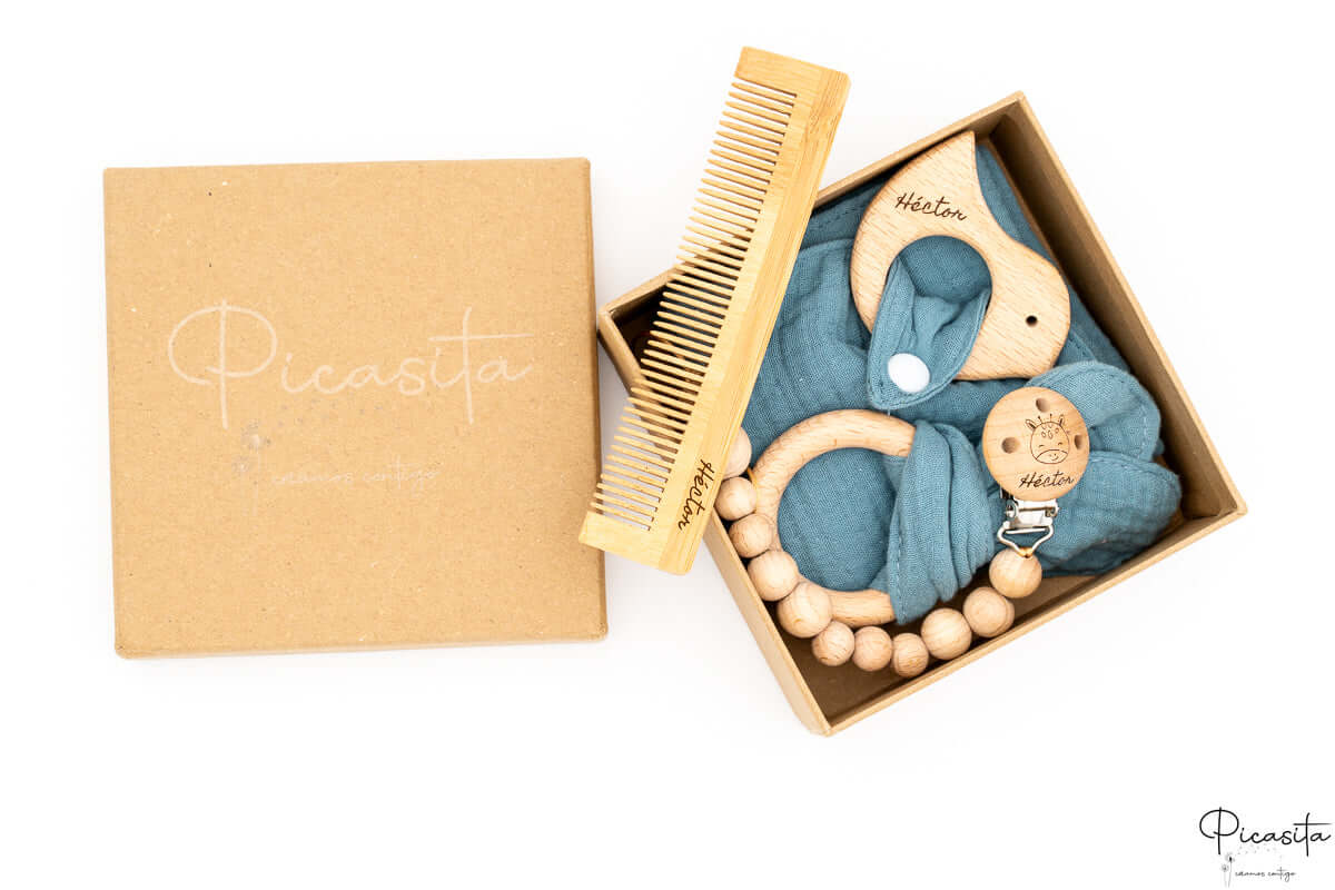 - 🌟 Mousseline d’attachement extra douce : Un indispensable dans toute corbeille de naissance. Cette mousseline agit comme un doudou, absorbant l’odeur maternelle pour calmer instantanément le bébé. Offrir une mousseline c’est offrir une polyvalence absolue, car elle sert à emmailloter, protéger du soleil ou nettoyer. De plus, cette mousseline inclut une petite figurine en bois à son extrémité que nous personnalisons également pour vous.