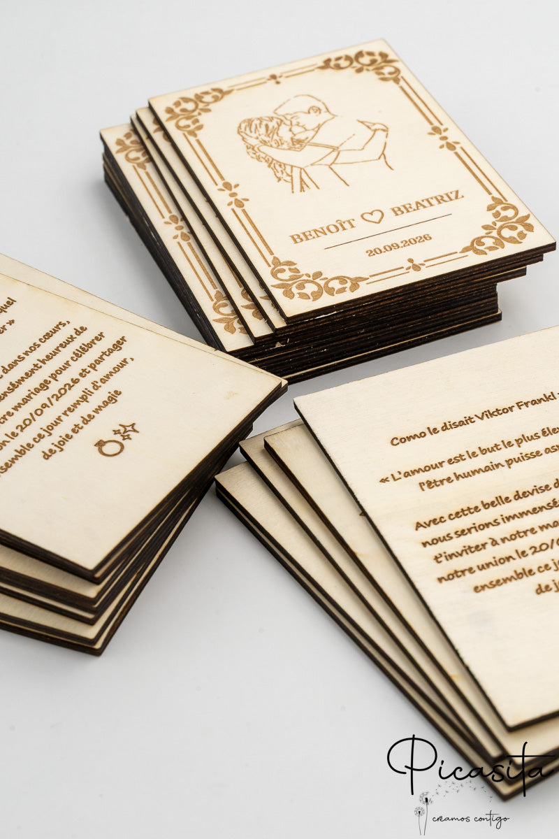 Le jour de votre union mérite d'être annoncé de manière vraiment spéciale. Choisir une invitation de mariage en bois ne communique pas seulement les détails de votre célébration, mais transmet aussi une profonde sensation de chaleur, d'élégance rustique et d'exclusivité. Contrairement au papier traditionnel, le bois offre une texture naturelle et une durabilité qui font de cette annonce un souvenir durable pour tous vos proches.