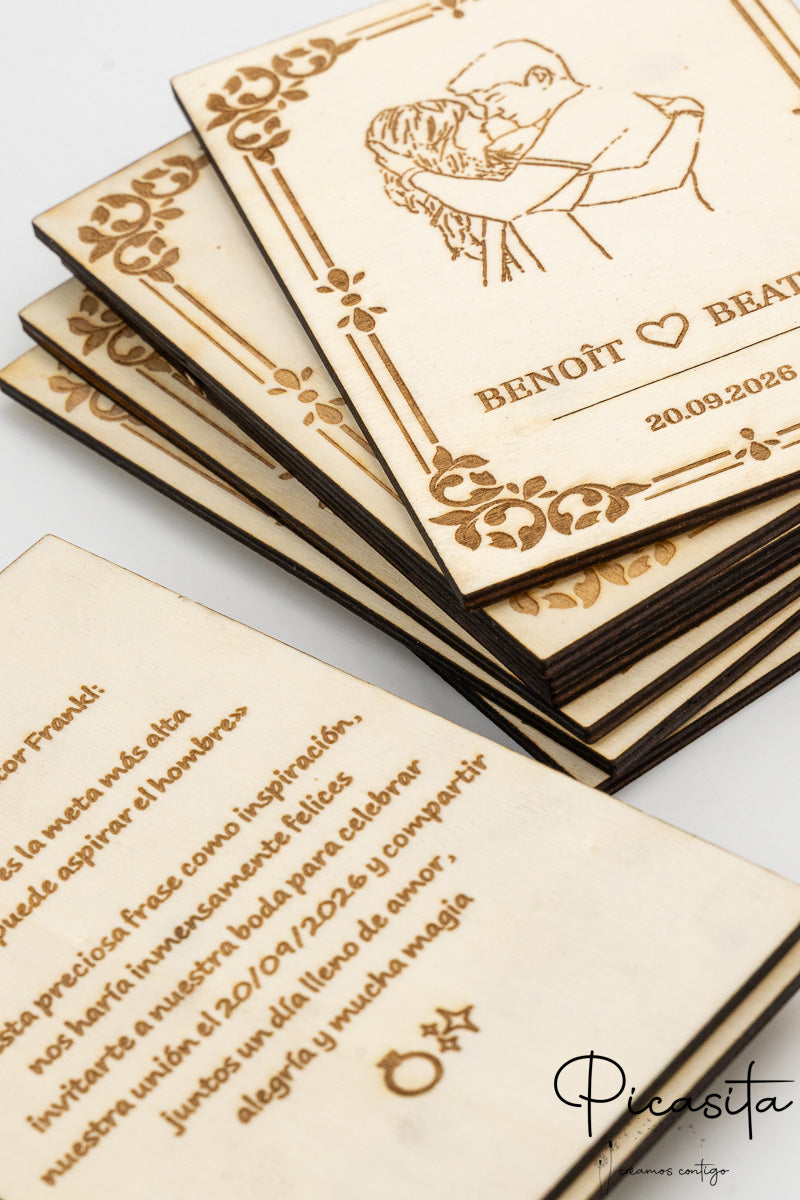 Chez picasita, nous savons que chaque couple est unique. C'est pourquoi cette invitation de mariage en bois est disponible en cinq magnifiques variantes qui s'adaptent à votre style : Courbe à droite avec de délicats motifs floraux, la classique Vintage Rectangulaire, le design romantique des Lys, l'élégance des Roses ou la sophistication du modèle Arc. Chaque pièce se distingue par ses découpes précises et ses gravures qui mettent en valeur la beauté naturelle du matériau, créant un contraste visuel étonnant.