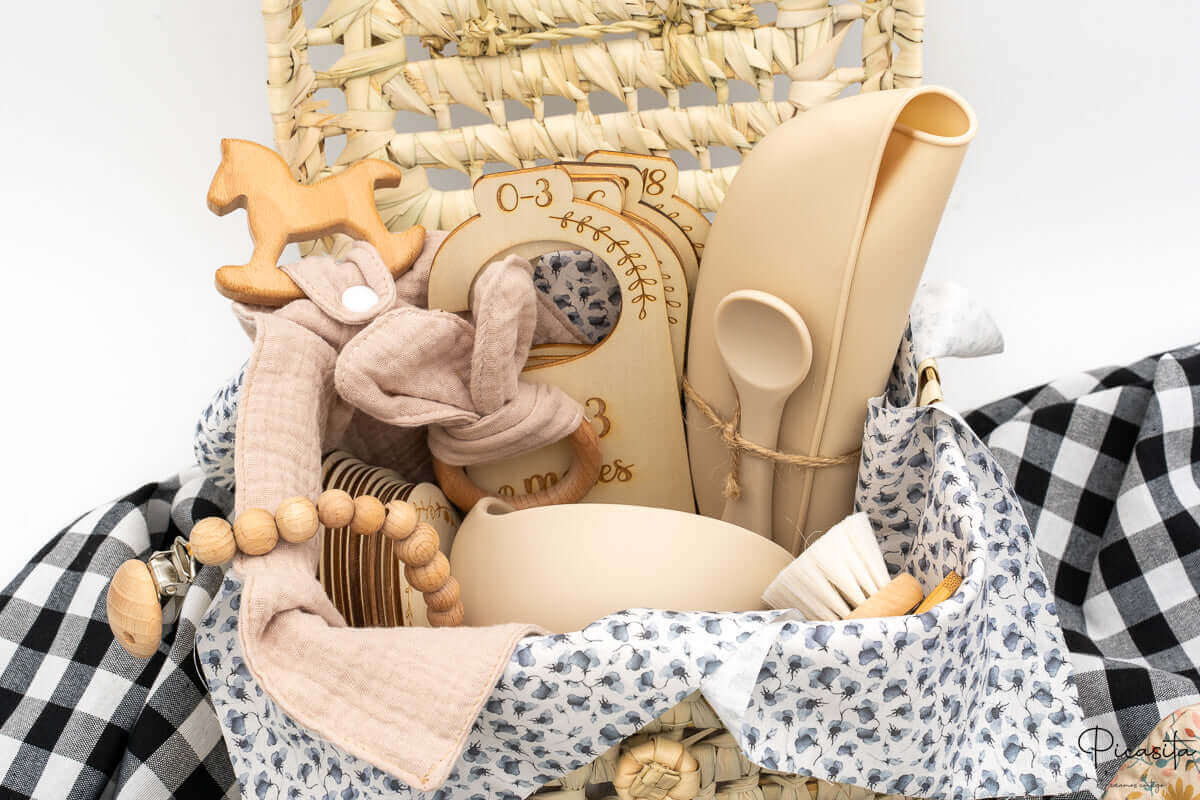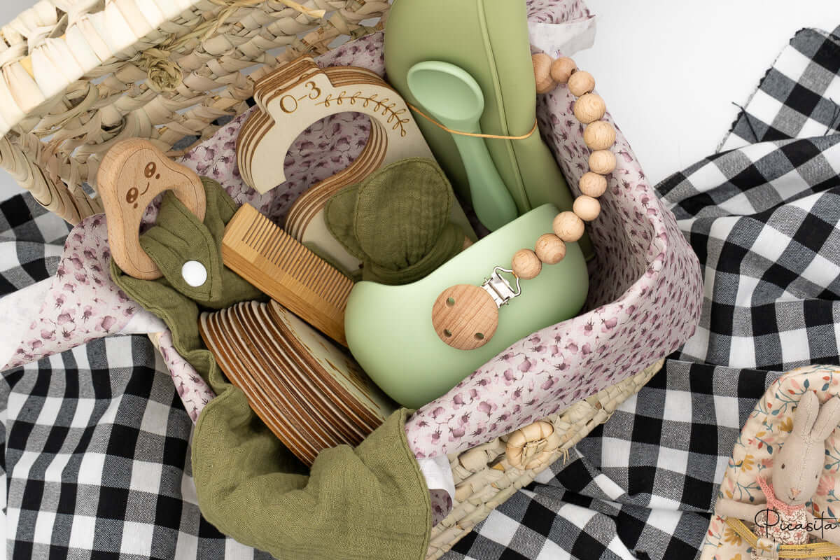 Chaque élément de ce charmant panier bébé a été soigneusement sélectionné en fonction des besoins réels des premiers mois de vie. On y trouve la délicatesse du silicone aux tons doux et poudrés, la chaleur inimitable du bois naturel et la douceur respirante des mousselines. Ce panier pour bébé est la fusion parfaite entre une esthétique rustique intemporelle et une fonctionnalité moderne.