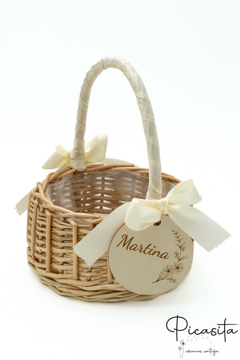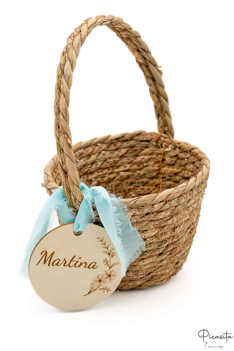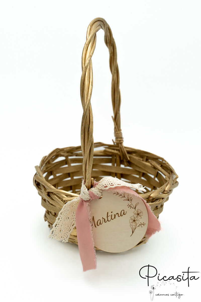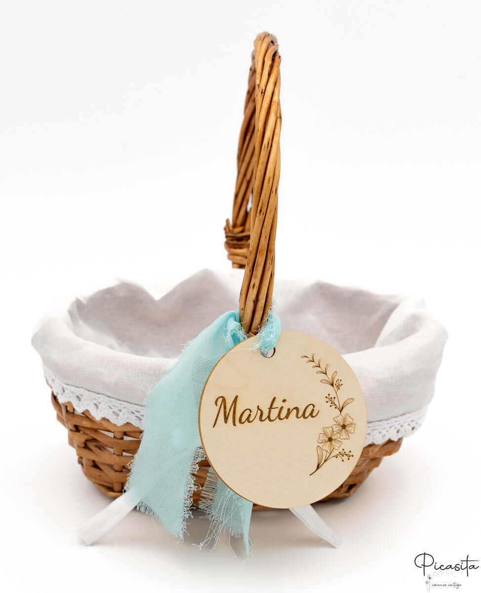Nous savons que les détails personnalisés sont ceux que l'on garde dans le cœur. C'est pourquoi chaque panier pour demoiselles d'honneur inclut un cercle en bois de haute qualité, personnalisé avec le nom de l'enfant ou des phrases spéciales comme « Voici la mariée ». Cette personnalisation est réalisée par gravure laser de haute précision, obtenant une finition élégante et permanente en ton monochrome. De plus, vous pouvez choisir la couleur du ruban en tissu qui orne la poignée pour qu'il s'harmonise avec la palette de couleurs de votre union. Sur certains modèles sélectionnés, comme le petit panier pour pages de mariage avec tissu blanc, nous incorporons un élégant ruban en tissu blanc ajouré qui met en valeur le design artisanal.