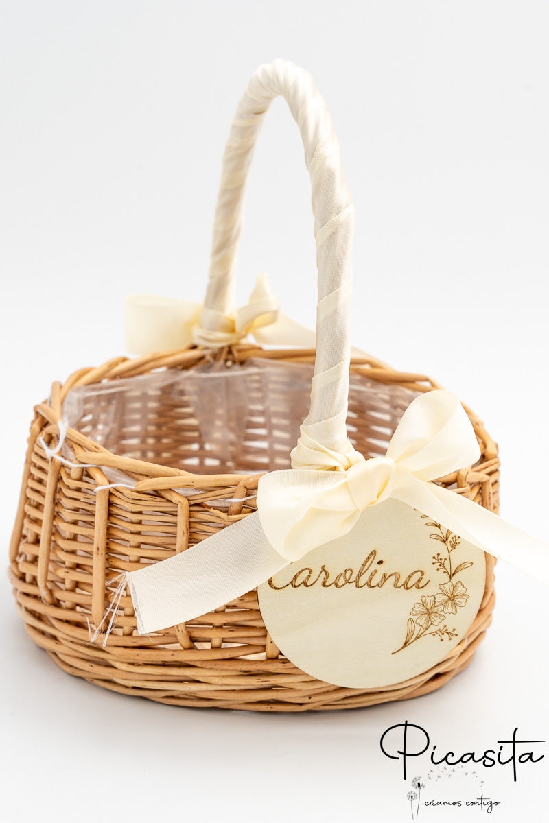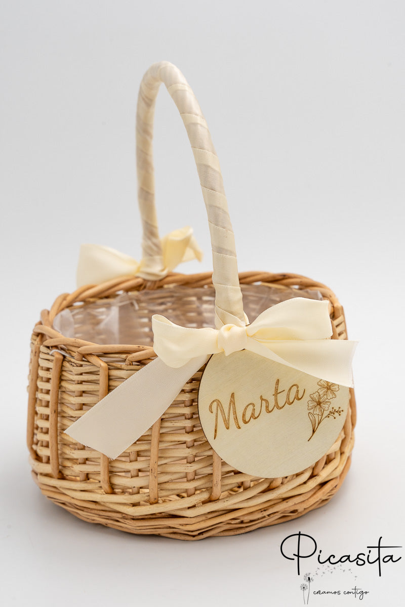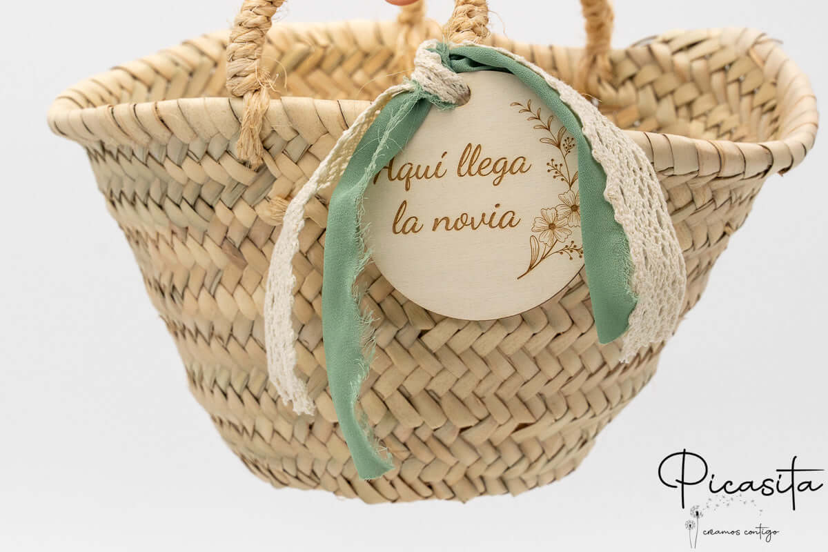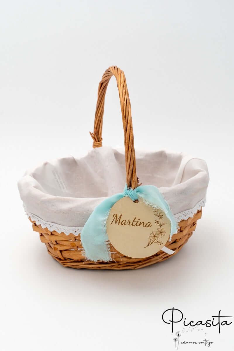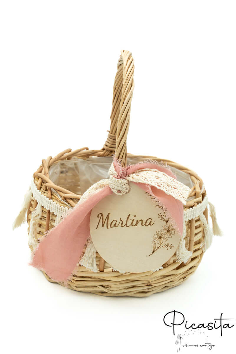 Nous savons que les détails personnalisés sont ceux que l'on garde dans le cœur. C'est pourquoi chaque panier pour demoiselles d'honneur inclut un cercle en bois de haute qualité, personnalisé avec le nom de l'enfant ou des phrases spéciales comme « Voici la mariée ». Cette personnalisation est réalisée par gravure laser de haute précision, obtenant une finition élégante et permanente en ton monochrome. De plus, vous pouvez choisir la couleur du ruban en tissu qui orne la poignée pour qu'il s'harmonise avec la palette de couleurs de votre union. Sur certains modèles sélectionnés, comme le petit panier pour pages de mariage avec tissu blanc, nous incorporons un élégant ruban en tissu blanc ajouré qui met en valeur le design artisanal.