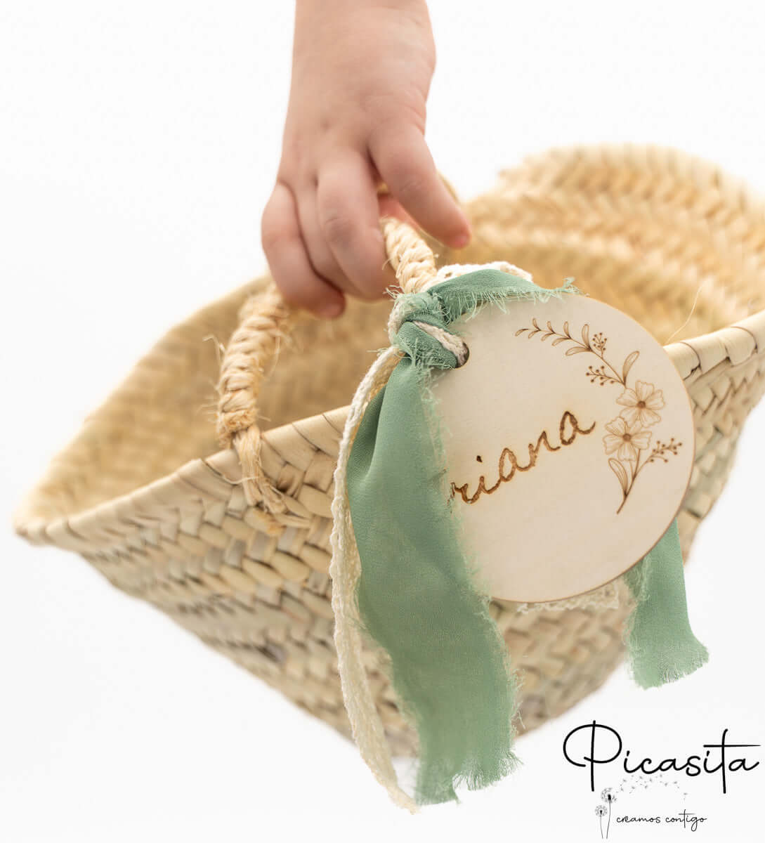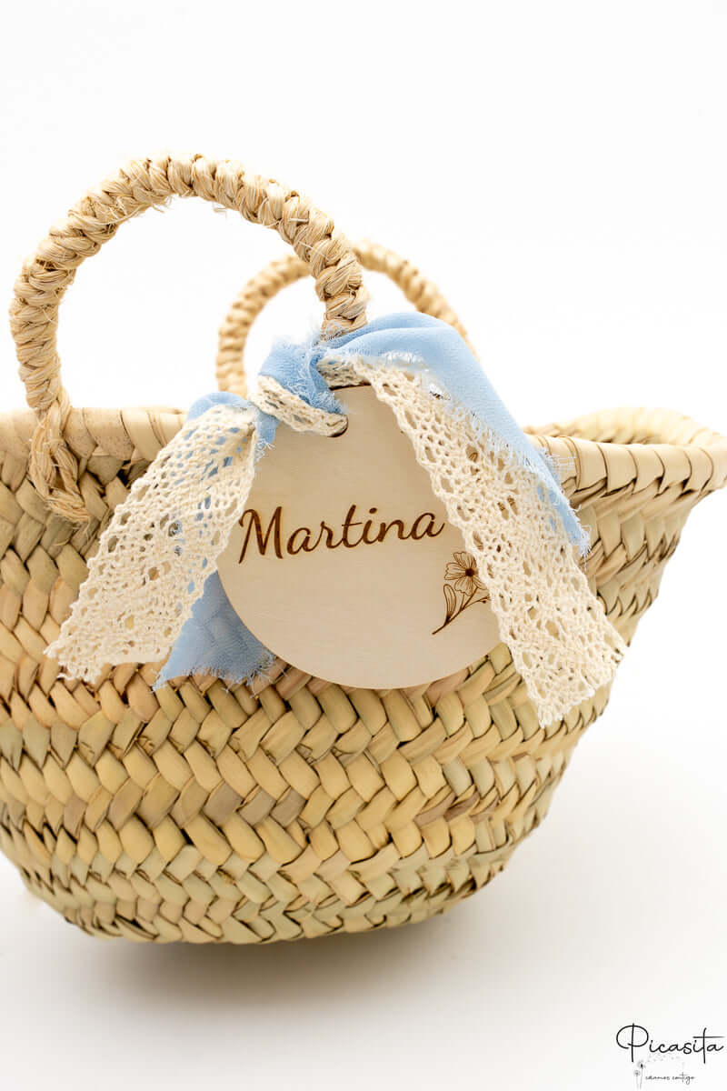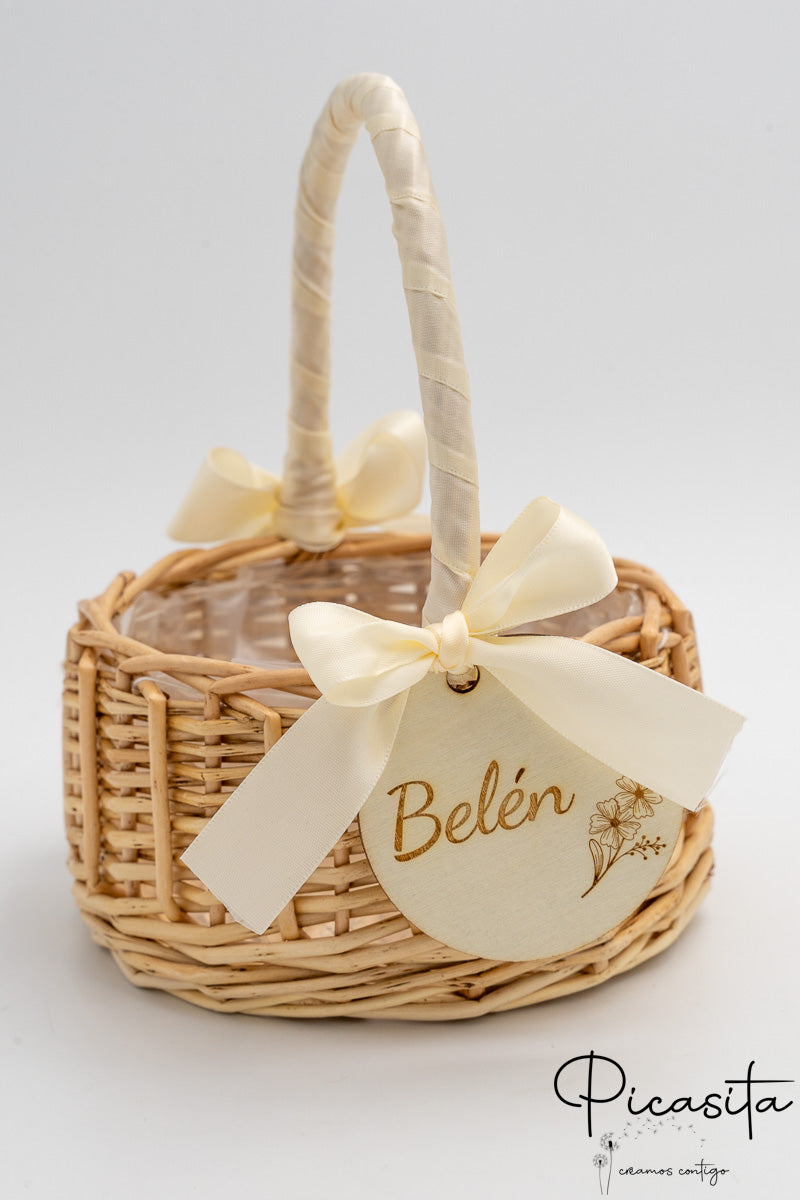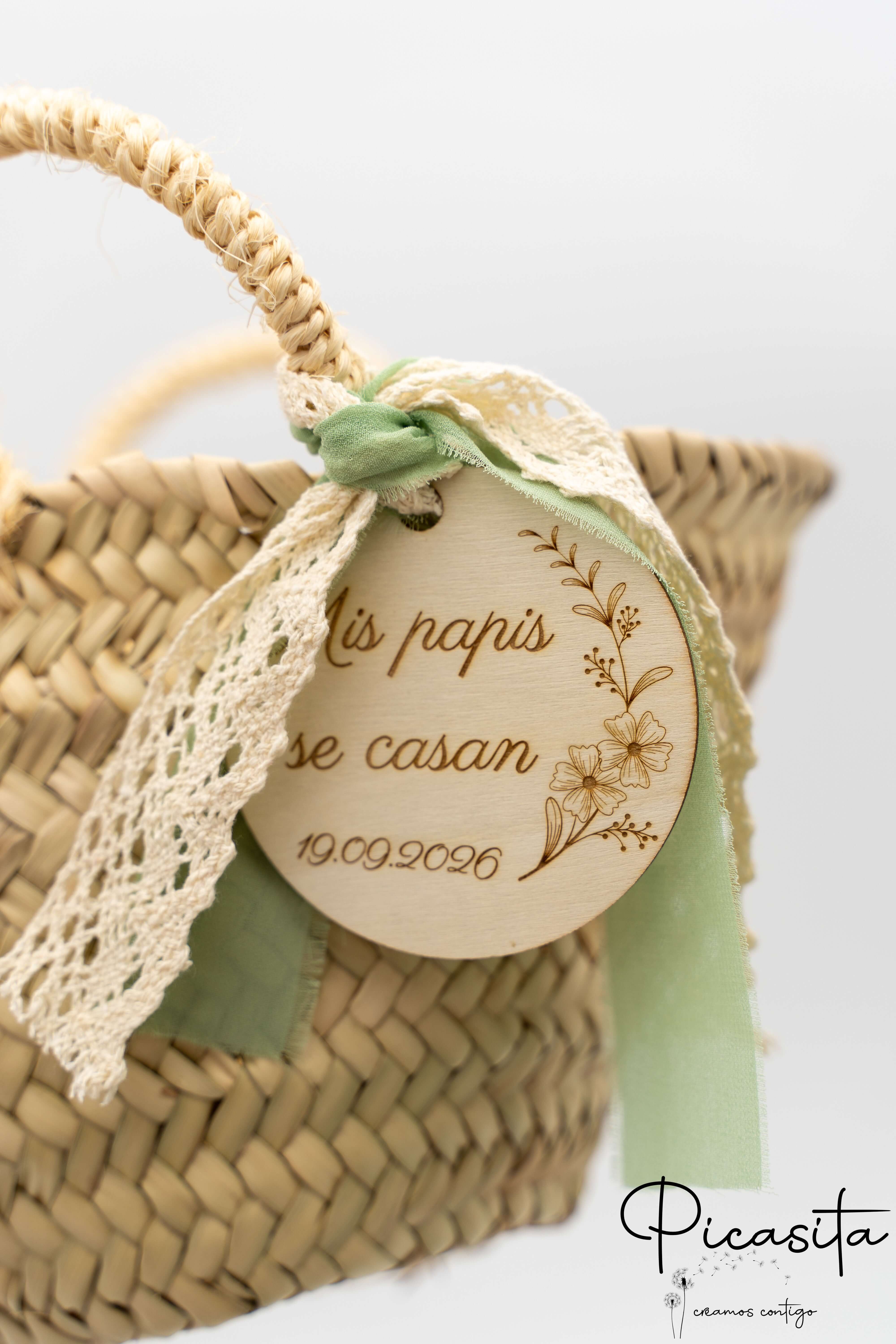 Nous savons que les détails personnalisés sont ceux que l'on garde dans le cœur. C'est pourquoi chaque panier pour demoiselles d'honneur inclut un cercle en bois de haute qualité, personnalisé avec le nom de l'enfant ou des phrases spéciales comme « Voici la mariée ». Cette personnalisation est réalisée par gravure laser de haute précision, obtenant une finition élégante et permanente en ton monochrome. De plus, vous pouvez choisir la couleur du ruban en tissu qui orne la poignée pour qu'il s'harmonise avec la palette de couleurs de votre union. Sur certains modèles sélectionnés, comme le petit panier pour pages de mariage avec tissu blanc, nous incorporons un élégant ruban en tissu blanc ajouré qui met en valeur le design artisanal.