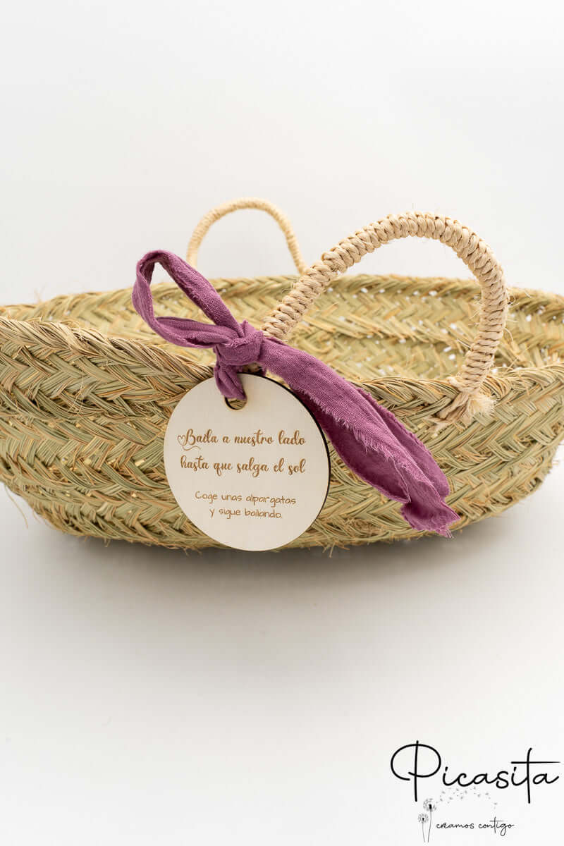 Ce qui fait vraiment de ce panier à espadrilles une pièce unique et exclusive, c’est son niveau de personnalisation. Chaque panier inclut une jolie étiquette ronde en bois naturel sur laquelle nous appliquons une gravure précise au laser. Cette technique brûle délicatement la surface du bois, laissant une élégante teinte brun foncé qui est totalement permanente, ne s’efface pas et ne s’use pas au contact. Vous pourrez graver la phrase de votre choix, invitant tous à continuer de danser jusqu’à l’aube. De plus, l’ensemble est orné d’un délicat ruban en tissu à texture rustique, dont vous pouvez choisir la couleur pour qu’elle s’harmonise parfaitement avec la palette chromatique de votre événement.