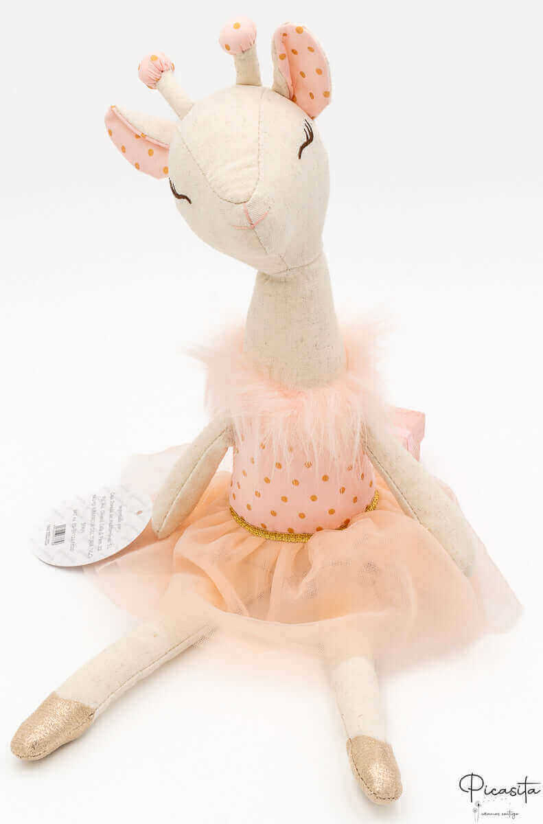 Les détails de cette poupée girafe sont faits pour séduire. Ses oreilles et ses petits bois présentent un imprimé à pois assorti, tandis que ses pieds brillent d'une finition dorée, comme si elle portait de véritables chaussons de ballet. L'expression de son visage, avec les yeux fermés et délicatement brodés, transmet une sensation de paix et de sérénité, invitant au repos et à l'affection. C'est une poupée en chiffon qui inspire le calme rien qu'en la regardant.