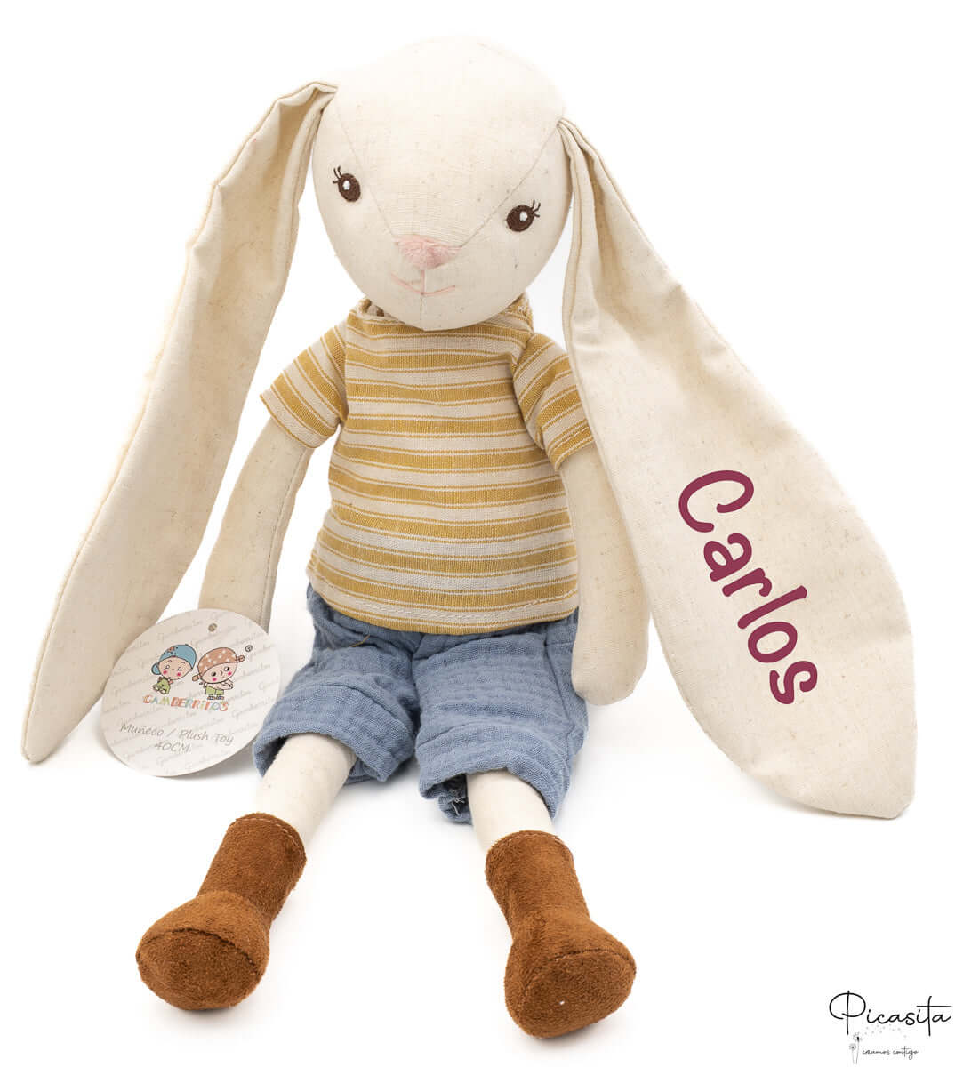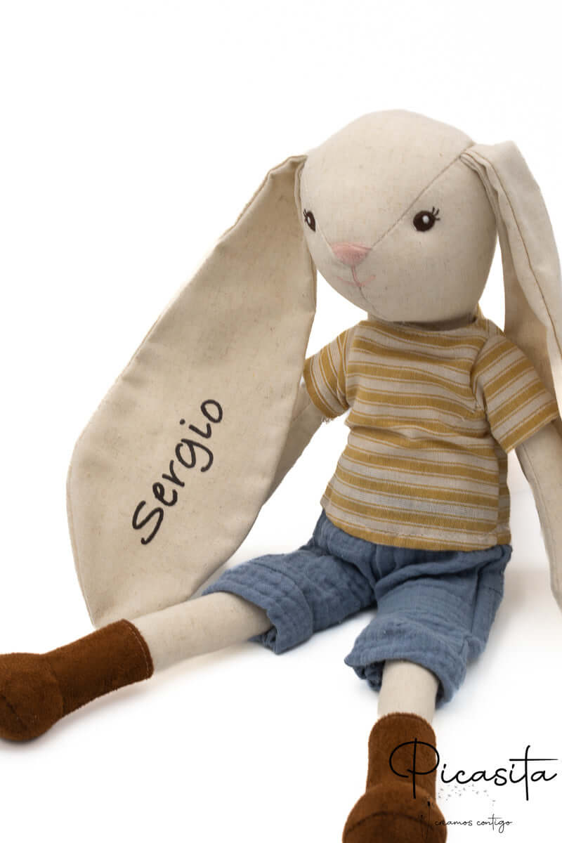 Nous personnalisons l’une des longues oreilles de la poupée lapin avec le prénom de l’enfant en utilisant un vinyle textile très résistant. Cette méthode garantit une finition nette, durable et très élégante, transformant la peluche en un souvenir inoubliable.
