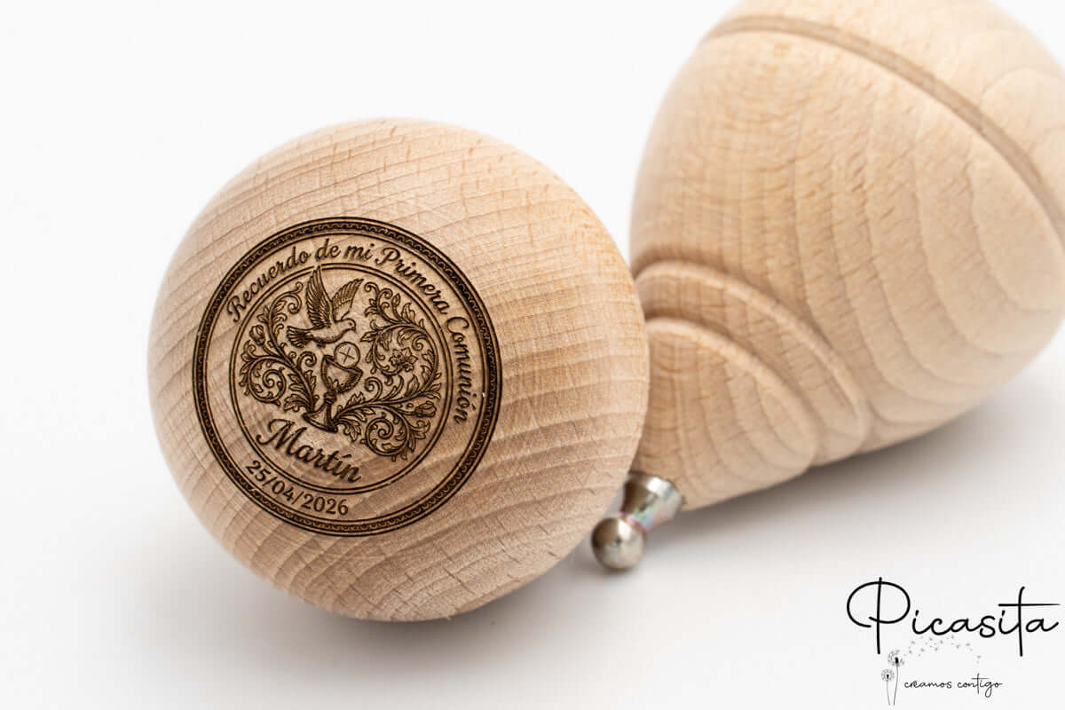 Fabriquée en robuste bois de hêtre naturel, chaque toupie personnalisée est conçue pour la durabilité et une rotation parfaite. Contrairement aux toupies classiques, ce modèle est spécialement fabriqué sans bouton sur le dessus. Pourquoi ? Pour offrir une surface plate et large afin que la gravure laser soit spectaculaire. En appliquant le laser sur le bois, nous obtenons un contraste en tons marron foncé ou grisâtres qui apporte une élégance rustique inégalée, sans avoir besoin d’utiliser des encres qui pourraient s’effacer avec les chocs ou le temps.